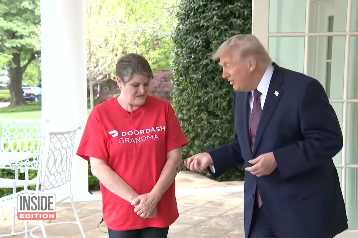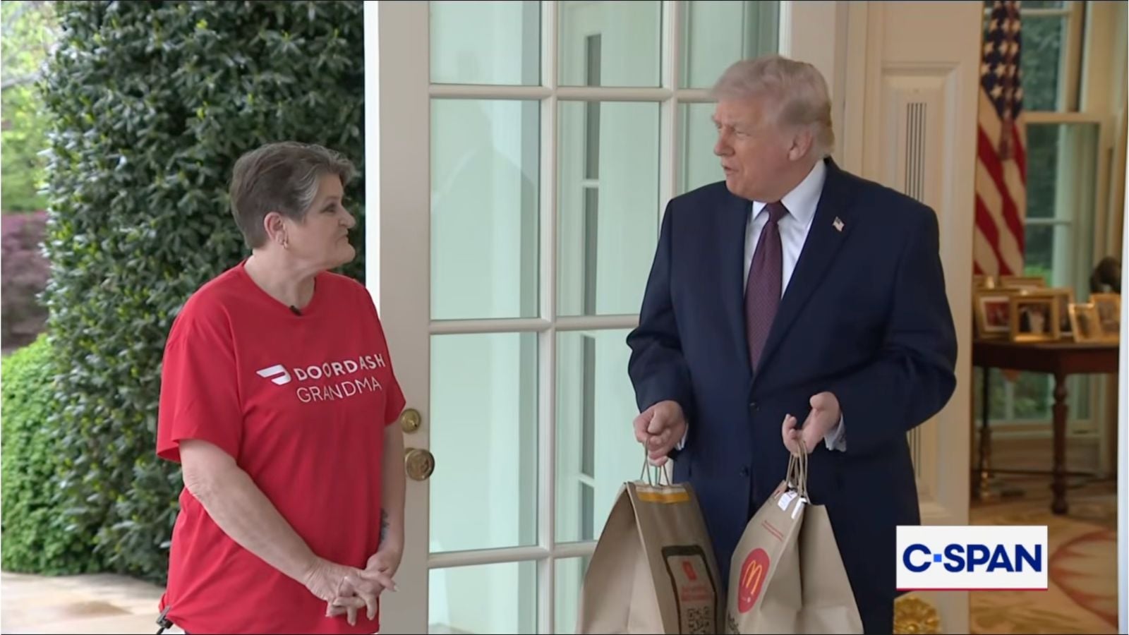 Sharon Simmons pulled up to the White House in a red t-shirt that said “DoorDash Grandma,” carried two bags of McDonald’s to the door of the Oval Office, and knocked.