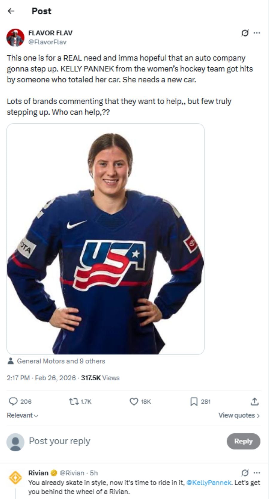 This week, Flavor Flav also used his platform to try to get a new car for Kelly Pannek, a U.S. women’s hockey gold medalist whose representative confirmed her car was totaled in a recent accident. Flavor Flav posted that she needed help. Then brands started showing up in the replies, including Rivian, which publicly offered to get her “behind the wheel” of one of its vehicles.