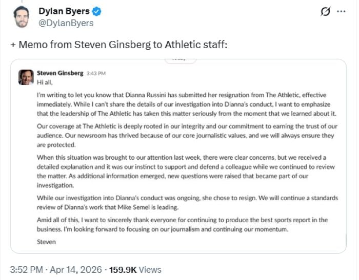 Russini worked for The Athletic, owned by the New York Times. That means editorial standards that treat the appearance of a conflict as a crisis in itself. When the photos dropped, her editor initially called them “misleading.” Within days, the Times opened an investigation, pulled her off reporting, and according to executive editor Steven Ginsberg, “additional information emerged” that raised “new questions.” By Tuesday, she was gone.