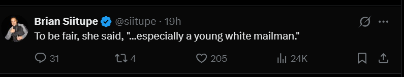 The internet didn’t hold back. On X, users mocked the phrasing with jokes about “young white mailmen” or “white male men.” One post from called it “pure state funded White Christian Nationalism” and garnered thousands of likes. Another user pointed out the irony of a Black student standing behind Kirk during the speech.