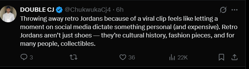 One fan’s response went viral the next day: a video montage from @mymixtapez showed the original clip playing alongside someone tossing white retro Air Jordan sneakers into an outdoor trash bin. Here’s the full story.