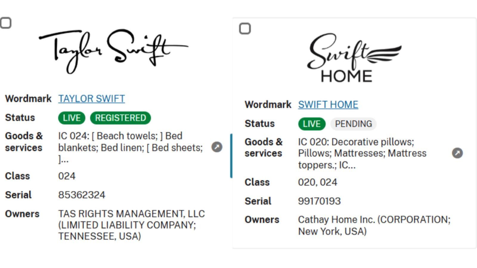 Swift’s team argued the brand’s cursive “Swift” logo was close enough to her signature-style mark that consumers might think the products were officially endorsed. Cathay’s attorney told Reuters the mark wasn’t being used in commerce and wasn’t essential to the business, so they walked away.