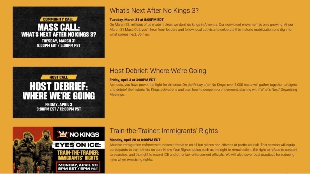 The movement’s own website makes the infrastructure play impossible to miss. It is already pushing a March 31 mass call. An April 3 debrief for more than 3,000 local hosts. An April 20 train-the-trainer session on immigrants’ rights and Know Your Rights tactics. That is not how you behave if you think the protest was the win. That is how you behave if you are converting one day of outrage into a recurring operation.