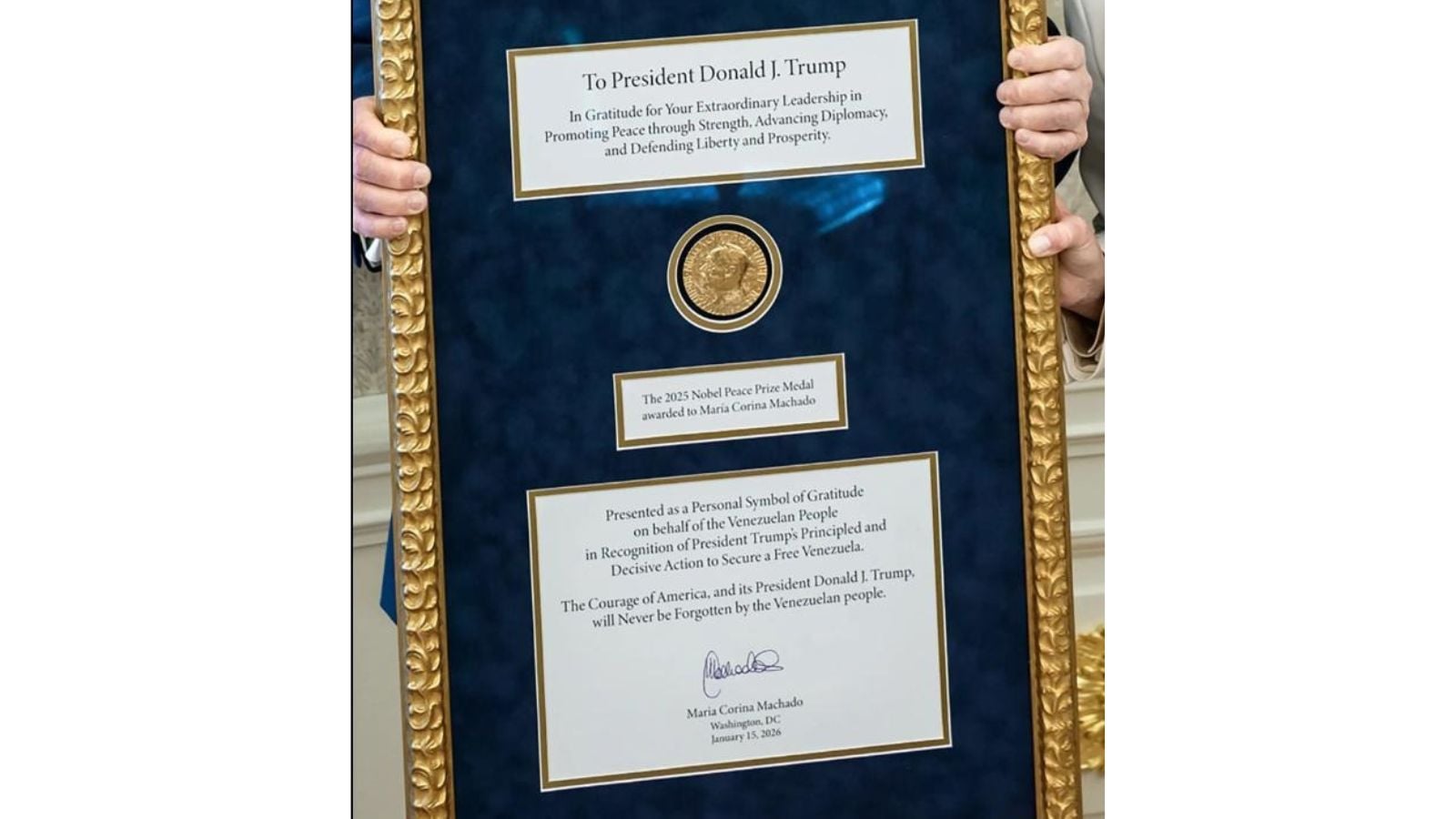 Venezuelan opposition leader María Corina Machado walked into the White House on Thursday carrying the one thing Donald Trump has wanted for years: a Nobel Peace Prize medal.