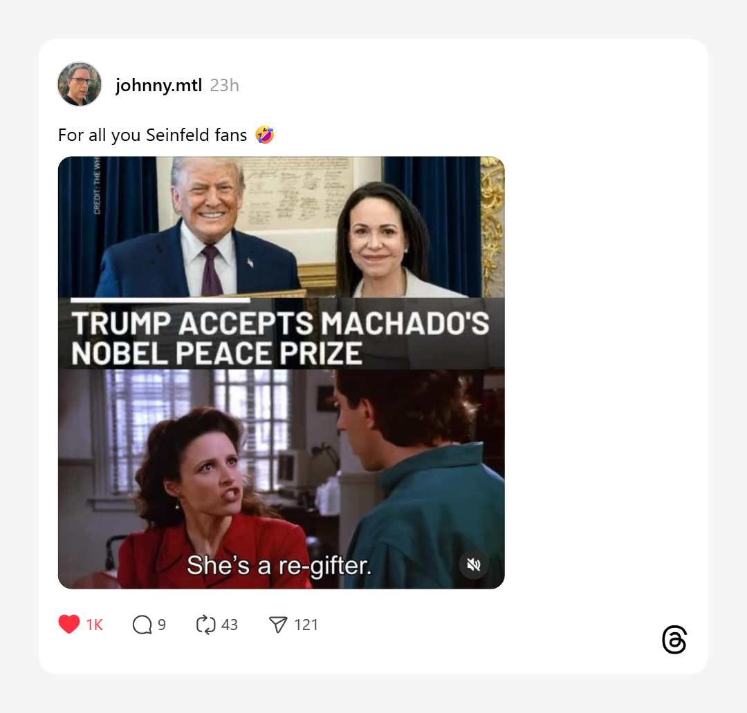 “For all you Seinfeld fans“ wrote @johnny.mtl on Threads, posting a split image of Trump and Machado above a clip of Elaine from Seinfeld declaring, “She’s a re-gifter.” The post drew over 1,000 likes.