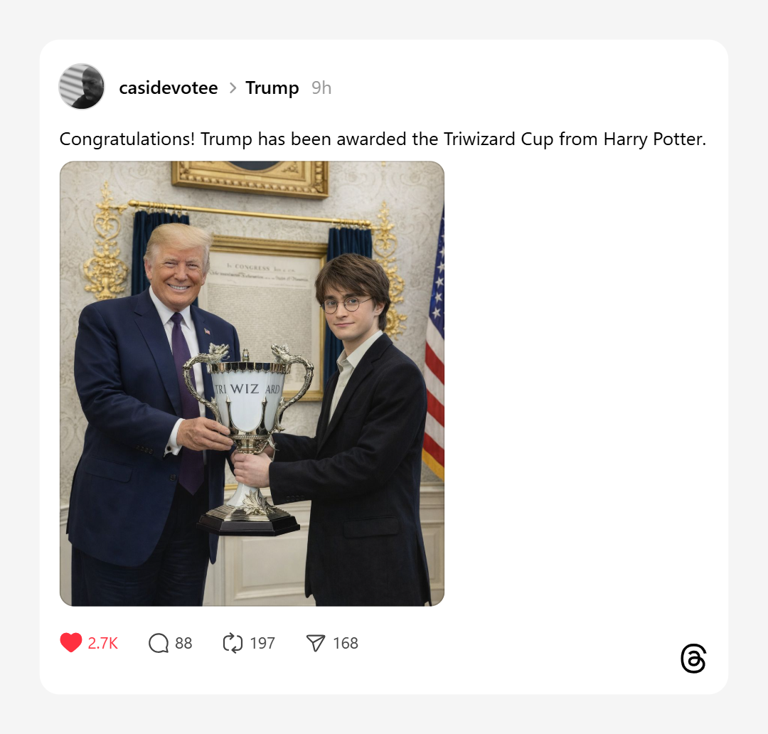 “Congratulations! Trump has been awarded the Triwizard Cup from Harry Potter,” wrote @casidevotee, posting an edit of Daniel Radcliffe presenting the trophy to a grinning Trump in the Oval Office. That one pulled 2,700 likes.