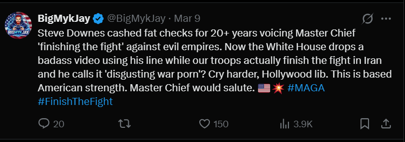 Downes didn’t waste time. On March 8, 2026, he fired off a post on X that went viral. “It has come to my attention that there is at least one propaganda video circulating that was either produced or at the very least endorsed by the White House that uses images of Master Chief and uses my voice to support the war in Iran,” he wrote.